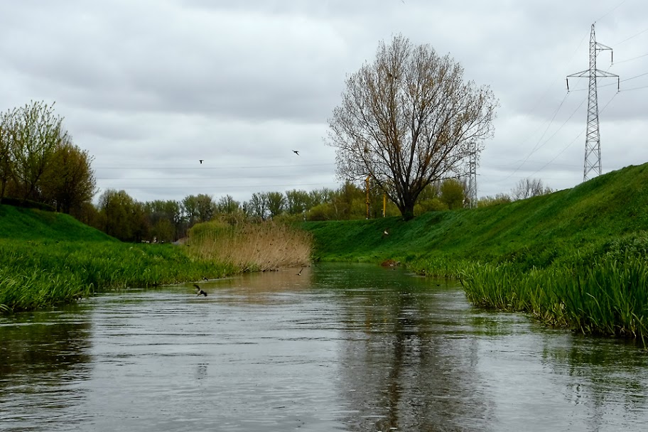 Za stadniną wpływamy już w uregulowaną część rzeki. Chyba wkrótce będzie padać, bo przed kajakiem latają nam jerzyki zwyczajne (Apus apus).