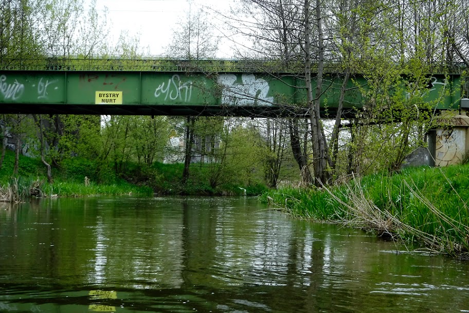 I zbliżamy się do mostu kolejowego, przed którym tabliczka informuje o bystrzejszym nurcie.