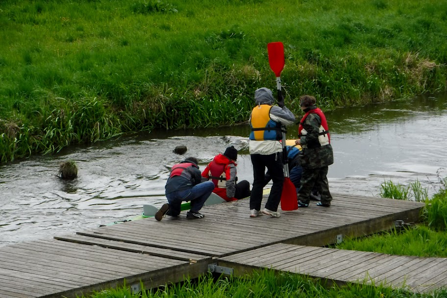 Niski stan wody, pomost dość wysoko - trzeba sobie pomagać.
