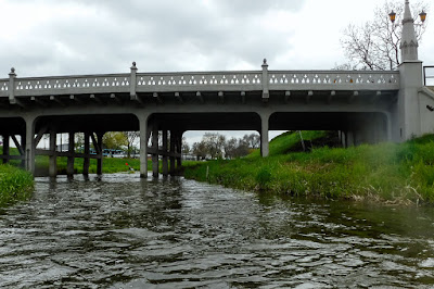 Wreszcie mam okazję zobaczyć miasto niejako "od dołu". Początkowo płyniemy wzdłuż ulicy Nałkowskich oraz Romera (po prawej stronie) i ścieżki rowerowej (po lewej stronie rzeki). Nad rzeką przerzucone są liczne mostki.