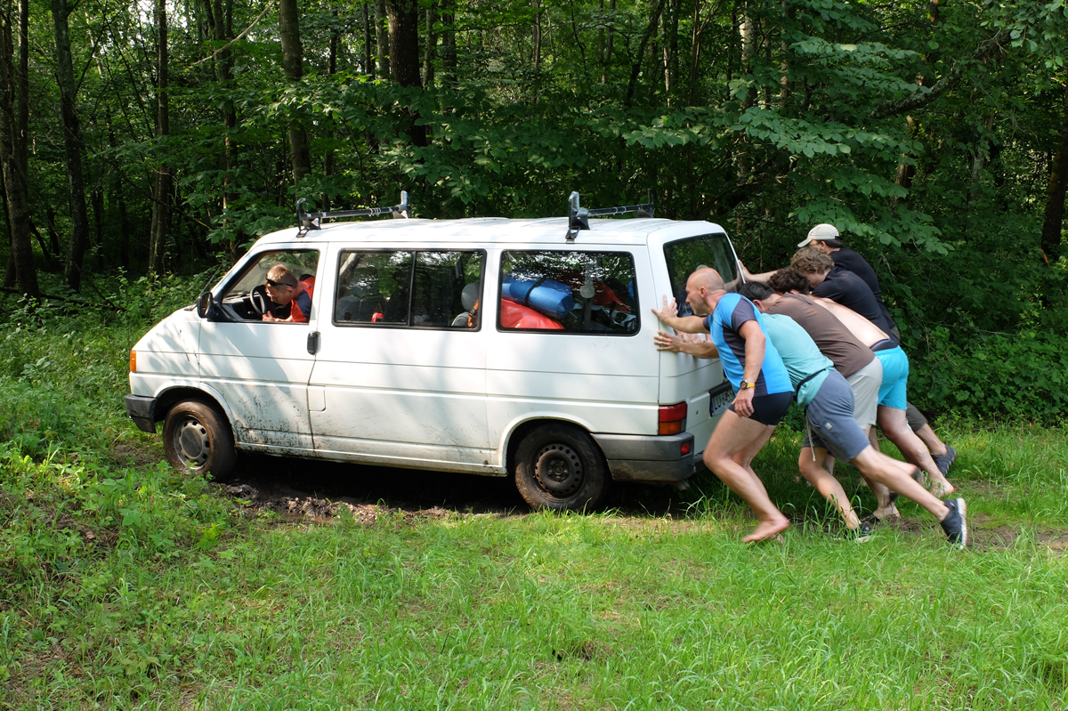 niespodzianka. Nasz kierowca dzwoni, że po drodze zakopał się w błocie w lesie.