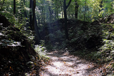 "Burzą się dróg wymiary porudziałym wiatrem, staje się październik w kapocie podartej..." Wwędrowaliśmy wczoraj w październik w złotawej koszuli. Były stare chaty, pola, lasy, a nade wszystko wspaniałe wąwozy. Była zieleń, złoto, czerwień, brąz, czerń. Były liście, szelesty, ciamkanie błota, ślizgi na mokrych korzeniach. Na koniec - posiadówa w knajpce w Puławach. Wszystko jak trzeba.
